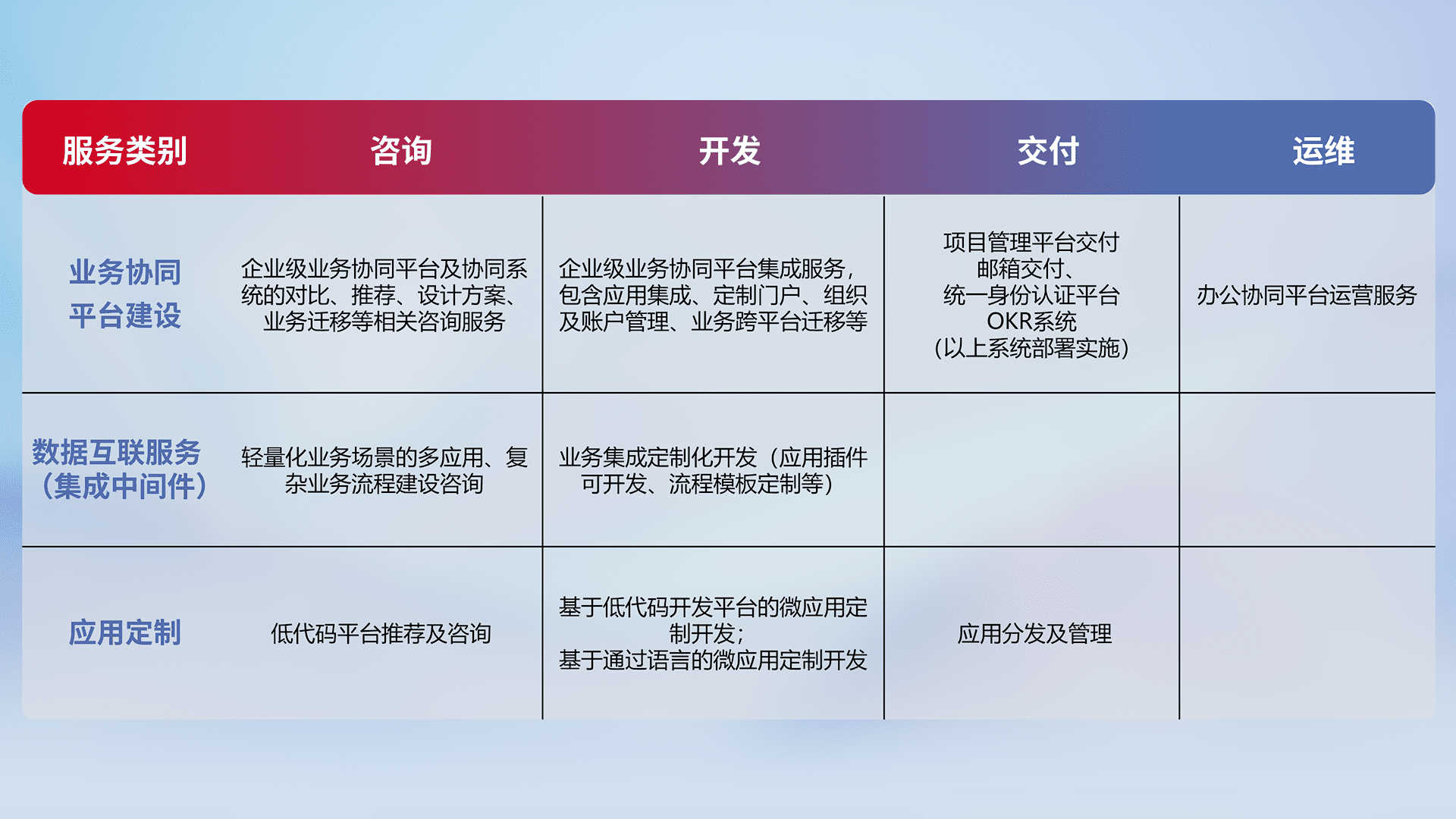针对钉钉、、企微、、、IDaas等平台级产品提供产品的规划、、方案、、交付、、、、定制化开发等服务,,实现如统一协同办公、、智能客户服务、、、混合会议管理、、、、智能数据查询、、、等业务场景,,实现数字化转型。。